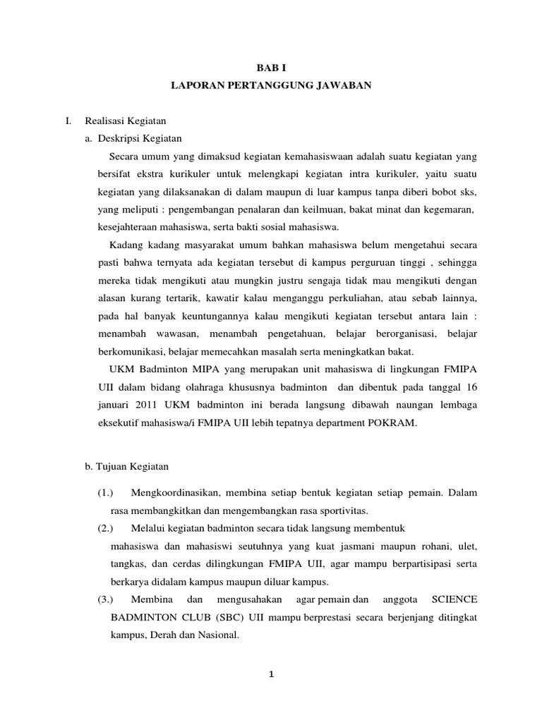 Di mana laporan pertanggungjawaban ini membutuhkan bukti dokumen atau laporan yang sebagai tanggung jawab dari kegiatan masing-masing divisi. Secara umum laporan ini memberikan keterangan yang rinci mengenai sumber pemasukan pengeluaran dan penggunaannya. Contoh Laporan Pertanggung Jawaban LPJ I.